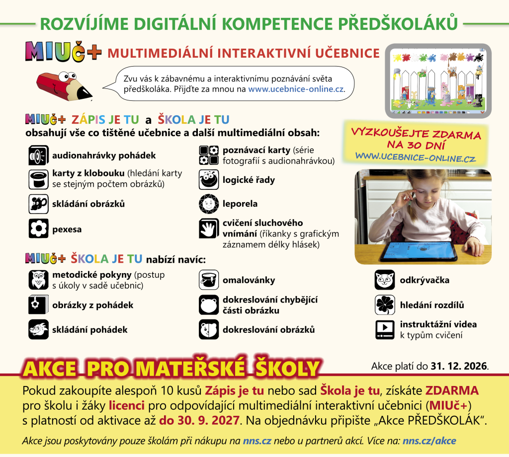 • školní multilicence na 1 rok k MIUč+ Čteme a píšeme s Agátou, Matýskova matematika pro 1. ročník a Oskarova prvouka 1