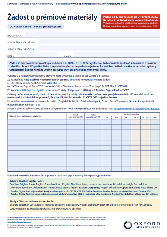 1. Stáhněte si do počítače formulář žádosti o prémiové tituly z www.oup.com/elt, sekce Nabídka pro školy.