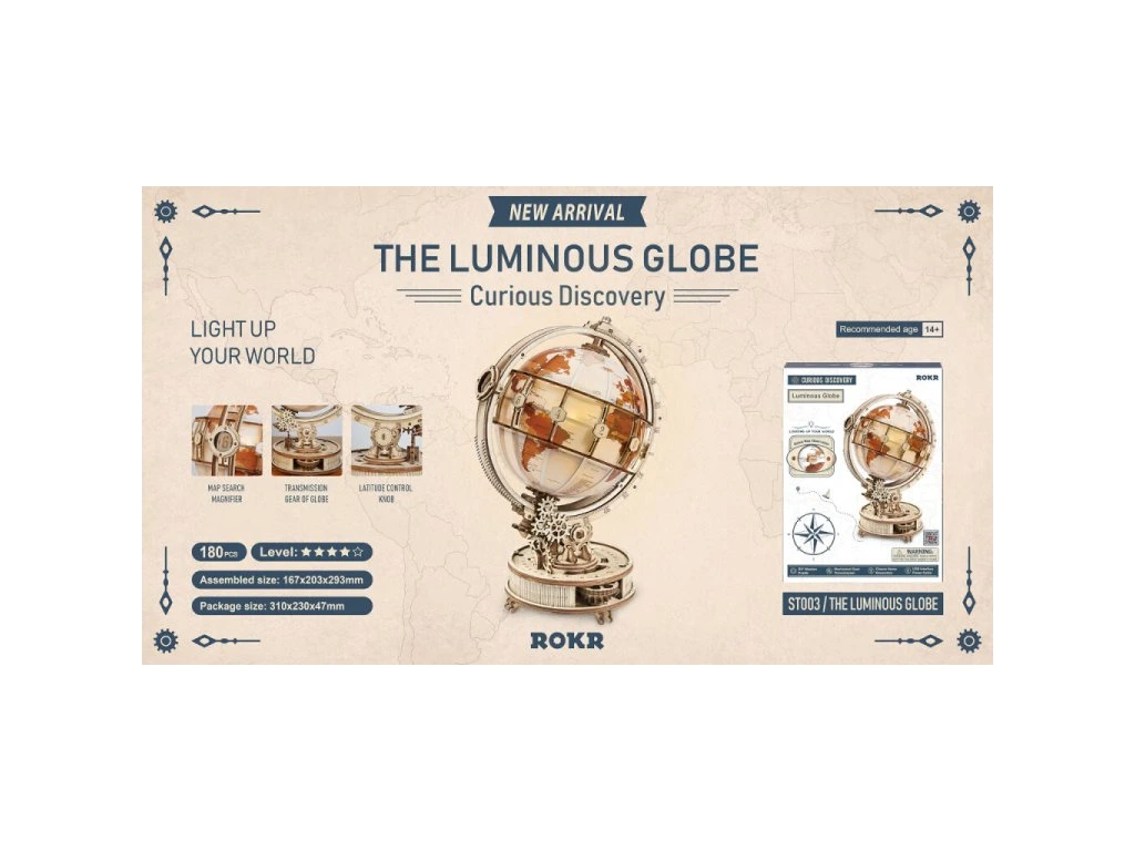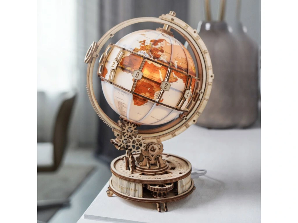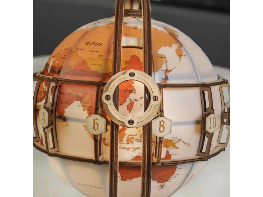 Glóbem je možno otáčet prostřednictvím částečně odhalené a poutavě zpracované soustavy převodů. Na svém obvodu je opatřen také mechanicky ovládanou lupou, s pomocí které přečtete i nejdrobnější nápisy na jeho povrchu. Členitá konstrukce je vyvedena v retro stylu, zdobí ji četné ornamenty, ale také stupnice k určování zeměpisné polohy, nebo označení časových pásem. Skládačka je vybavena detailním návodem k sestavení.
