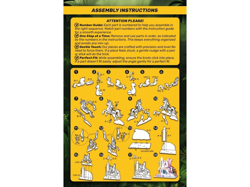 Jednotlivé díly z dřevěné překližky jednoduše vymáčknete a dle přiloženého návodu krok za krokem skládáte. Puzzle nemusíte lepit lepidlem, pak je lze kdykoliv rozložit a znovu složit. Doporučujeme si proto ponechat návod ke stavbě. Barevné dřevěné 3D puzzle jsou opatřeny kvalitním potiskem.
