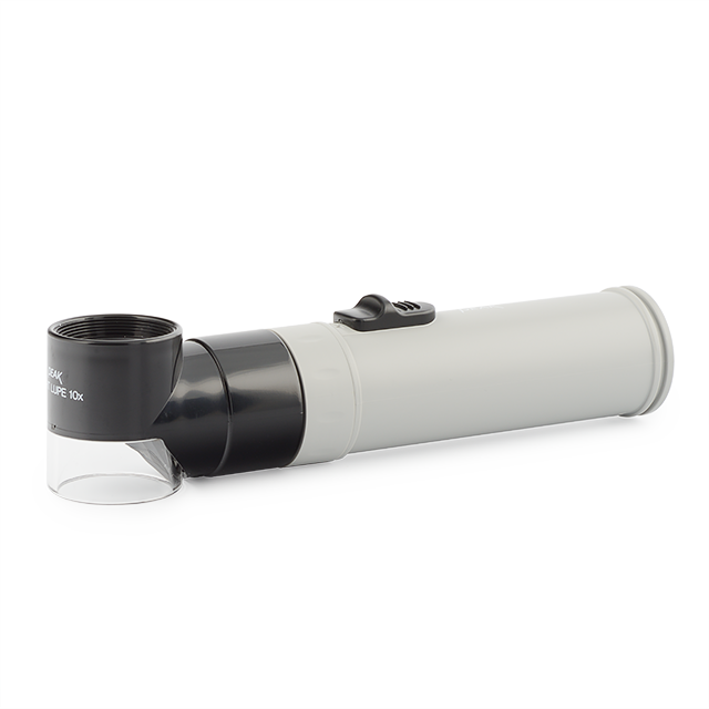Ruční aplanatická lupa se zvětšením 10× a vestavěným osvětlením.