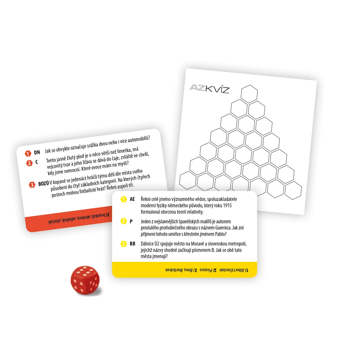 Balení obsahuje: 60 oboustranných karet s 360 otázkami, 70 záznamových tabulek s herním plánem, 1 bodovou hrací kostku.