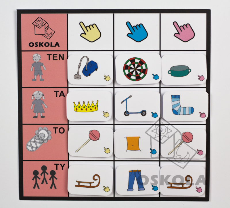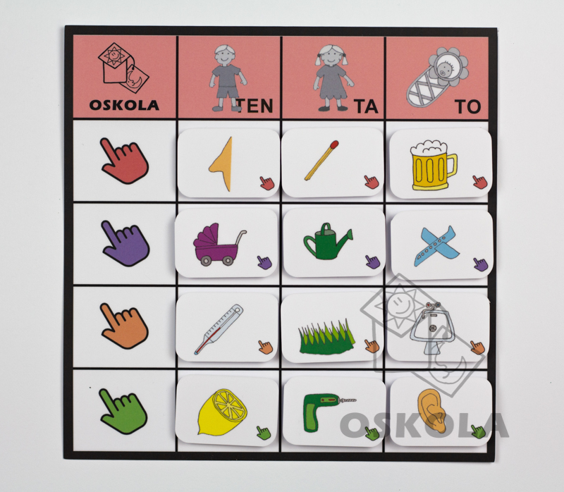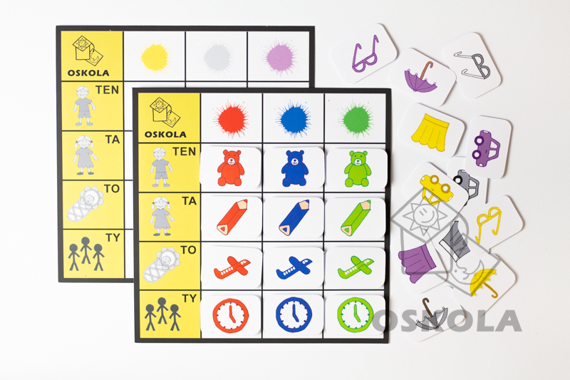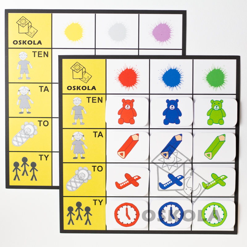 Každá tabulka obsahuje počty slabik a úkolem je správně přiřadit kartičky se slovy na základě barvy a rodu slov. Tato sada je skvělým nástrojem pro výuku jazyka a barev u dětí.