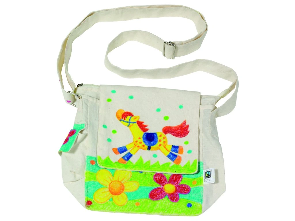 Tahle taška není obyčejná běžná taška. Je to DIY taška na rameno z fair trade bavlny, kterou dítě může samo dekorovat barvami, fixami nebo látkovými textovými barvami. Výsledek je osobitý – každý kus bude originál, přesně podle vkusu dítěte nebo stylu místnosti.