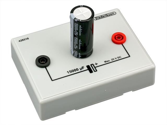 Blok s elektrolytickým kondenzátorem s vysokou kapacitou a dvěma bezpečnostními zdířkami o průměru 4 mm.
