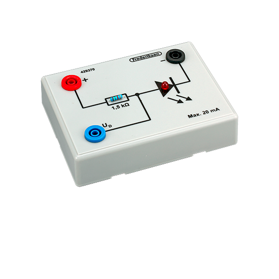 Blok s červenou LED diodou a se sériovým odporem. 4 mm bezpečnostní zásuvky, červená (plus) a černá (minus). Třetí bezpečnostní zásuvka (modrá) obchází sérii.
