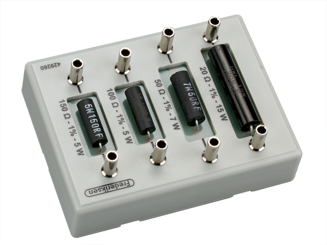 Blok se čtyřmi odpory a osmi zdířkami o průměru 4 mm. Odpory je možné zapojovat sériově i paralelně.