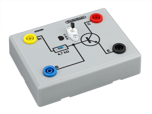Tři bezpečnostní zdířky jsou připojené přímo na tři výstupy tranzistoru (C, B a E). Čtvrtá zdířka (In) je připojená k bázi tranzistoru přes odpor 4,7 kΩ.