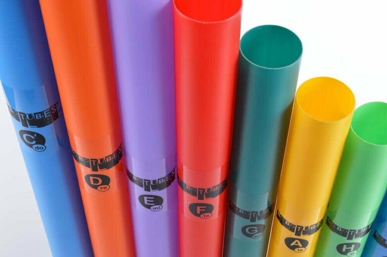 Sada samostatných plastových trubiček nařezaných na různé délky, díky čemuž jsou laděny podle tónu.