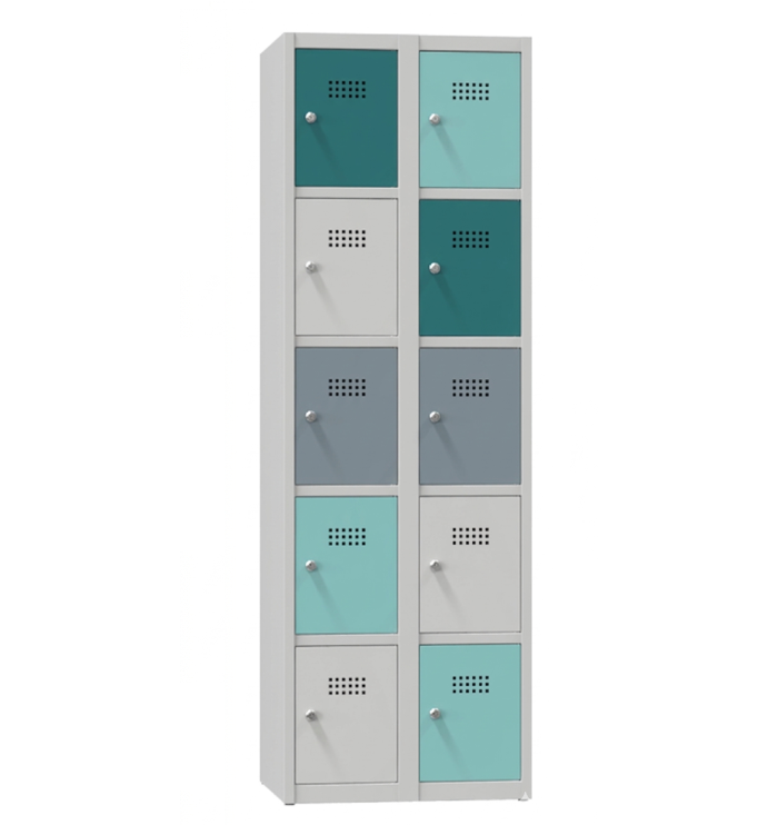 Skříň se deseti uzamykatelnými boxy. Výška 1850 x šířka 900 x hloubka 500 mm. Vyrobená z kvalitního plechu 0,75 mm silného. Celá skříň je opatřena žárově vypalovanou práškovou polyesterou barvou. Na přání umíme opatřit jakýmkoli typem a odstínem barvy. Větrací otvory ve dvířkách a v zádech skříňky.