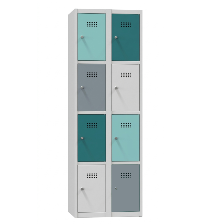 Skříň se osmi uzamykatelnými boxy. Výška 1850 x šířka 600 x hloubka 500 mm. Vyrobená z kvalitního plechu 0,75 mm silného. Celá skříň je opatřena žárově vypalovanou práškovou polyesterou barvou. Na přání umíme opatřit jakýmkoli typem a odstínem barvy. Větrací otvory ve dvířkách a v zádech skříňky.