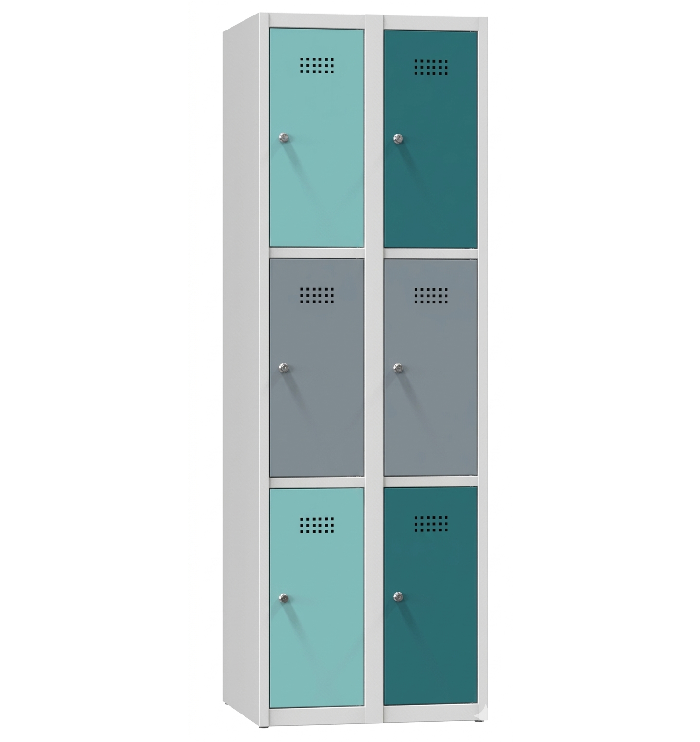 Skříň se šesti uzamykatelnými boxy. Výška 1850 x šířka 600 x hloubka 500 mm. Vyrobená z kvalitního plechu 0,75 mm silného. Celá skříň je opatřena žárově vypalovanou práškovou polyesterou barvou. Na přání umíme opatřit jakýmkoli typem a odstínem barvy. Větrací otvory ve dvířkách a v zádech skříňky.
