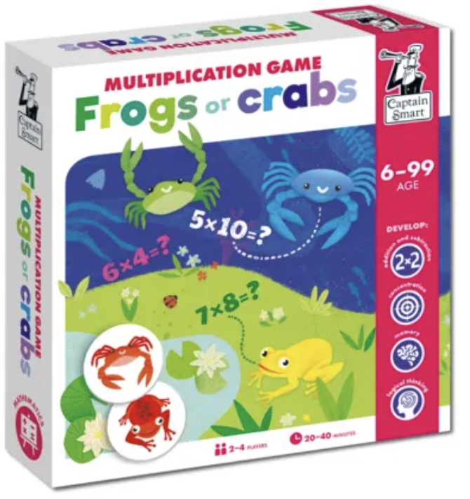 Vzdělávací hra Captain Smart – Žáby nebo krabi? učí děti od 6 let násobilku do 100 zábavnou formou. Hra zároveň rozvíjí strategické myšlení – děti se učí plánovat tahy, blokovat soupeře a matematiku si procvičují přirozeně při hře. Ideální pro domácí procvičování, školní družiny i první stupeň ZŠ.