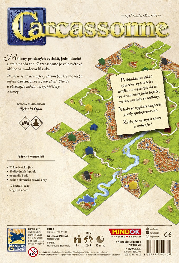 Ponořte se do atmosféry slavného středověkého města Carcassonne a jeho okolí. Stavte a obsazujte města, cesty, kláštery a louky. Hra je pokaždé jiná, krajinu vytváříte společně přikládáním dílků a vysíláte do ní své družiníky. Někdy se vyplatí soupeřit, jindy spolupracovat.
