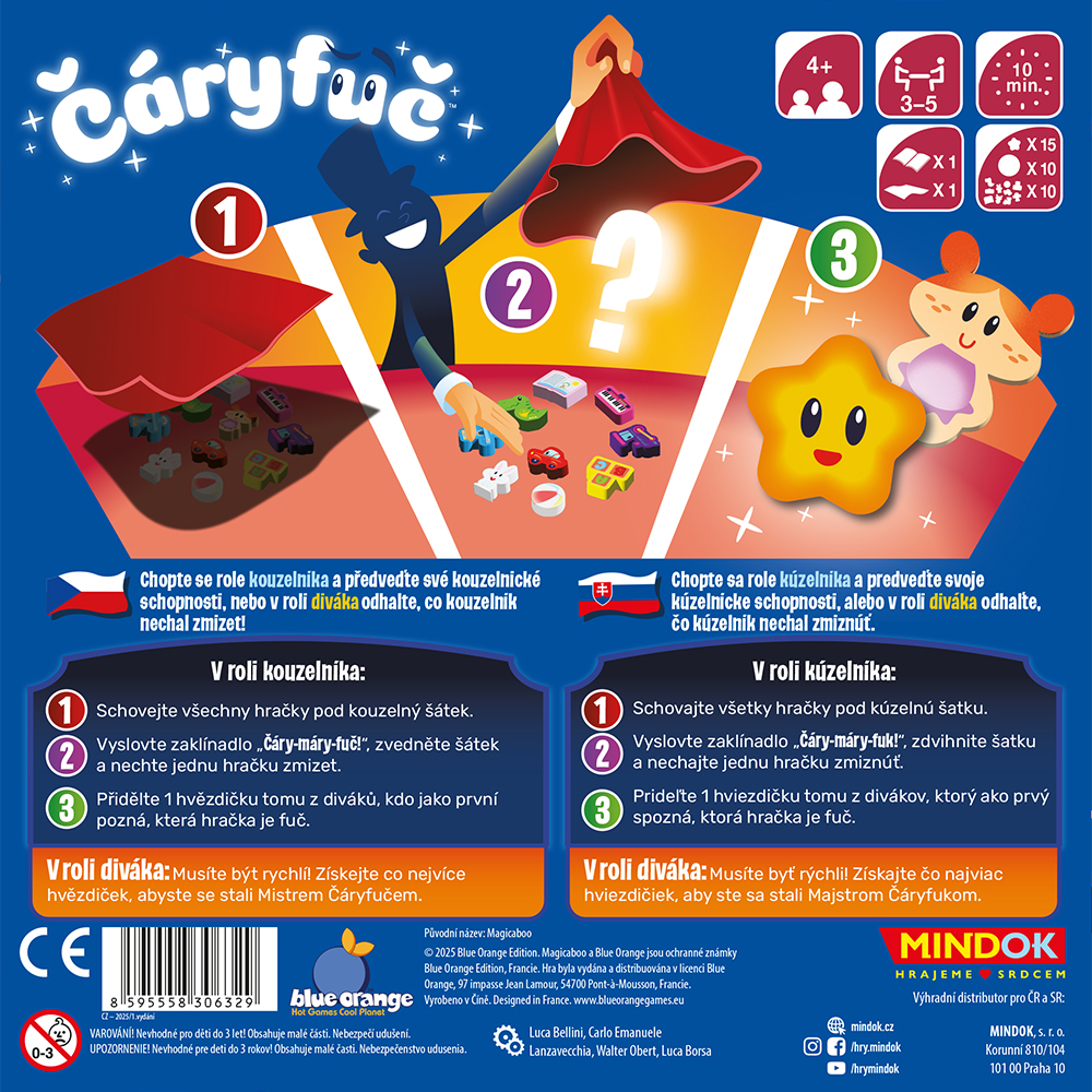 Rychle odhalte, která hračka zmizela pod kouzelným šátkem, a získejte nejvíce hvězdiček. Hra je plná napětí, rychlých reakcí a magické zábavy pro 3–5 hráčů od 4 let.
