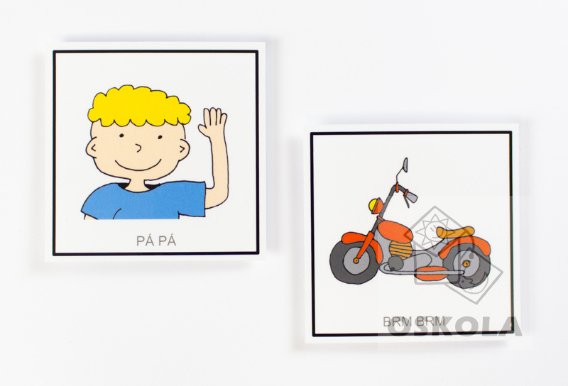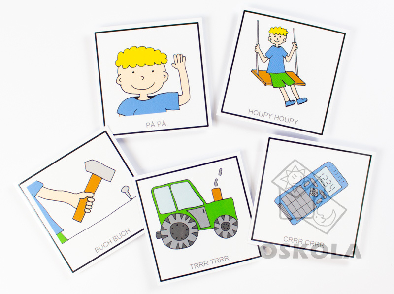 Na kartičkách jsou znázorněny zvuky a pod nimi jsou citoslovce těchto zvuků.