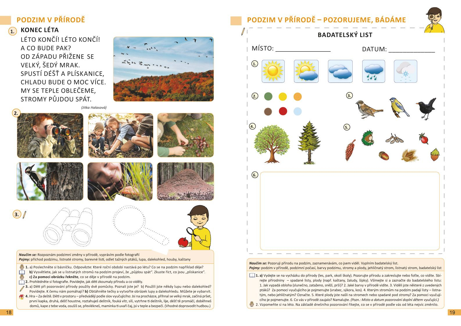 Učebnice je rozdělena do osmi témat, kde témata k ročním obdobím kopírují školní rok. Děti se postupně seznamují se svým okolím, přírodou ve všech ročních obdobích a získávají základní poznatky o lidském těle a vnímání světa. Vyzkouší si různé situace, budou bádat, klást si otázky a objevovat. Součástí učebnice jsou proto i náměty na pokusy, dále také tematické básničky, hádanky nebo doplňovačky.
