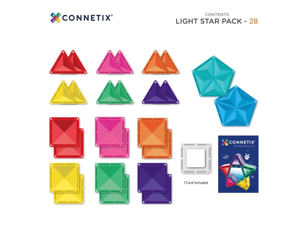 Connetix Light Star Pack je prémiová magnetická stavebnice, která spojuje kreativitu, barvu, světlo a vzdělávací hru do jedné sady. S 28 díly – mezi nimi speciální dobíjecí LED dlaždicí – nabízí tato sada unikátní možnosti pro malé stavitele od 3 let i jejich rodiče či pedagogy. Hra se světlem otevírá cestu k výuce STEAM (science, technology, engineering, art, mathematics) zábavnou formou.