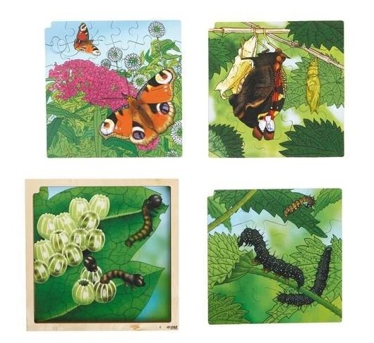 Nejsou puzzle jako puzzle a na těchto to vidíte na první pohled. Krásné celodřevěné, lakované a ke všemu nádherně ilustrované vývojové puzzle s životním cyklem motýla. Obrázek je formátově větší, stejně tak dílky takže se dobře skládají dětem už od tří let. Jednotlivé vývojové fáze můžete skládat ve vrstvách na sebe nebo jednotlivě vedle sebe. Navíc je dispozici volně ke stažení aplikace, namíříte telefon nebo tablet na složený obrázek a můžete tak studovat vývoj motýla v reálném video snímku i se zvuky. V aplikaci se navíc dozvíte spoustu zajímavostí o životě motýla. Aplikace je dostupná v App Store a v Google play. Doporučujeme!