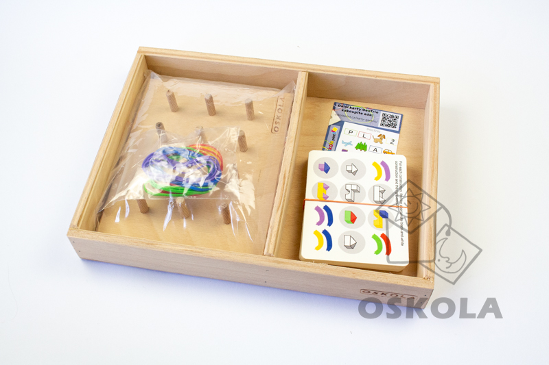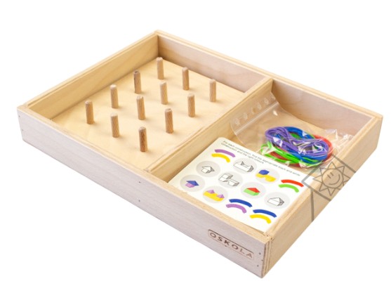 Úkolem je vytvořit čtyři trojice - vždy tři objekty na desce, a příslušné kolíčky spojit barevnou gumičkou.