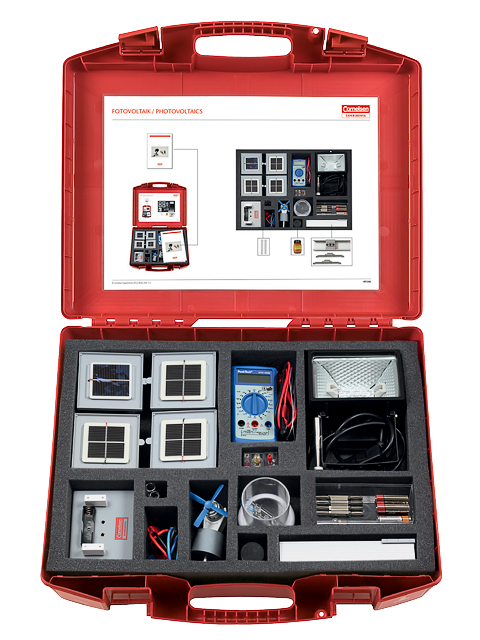 Moderní demonstrační a studentská souprava fotovoltaika s veškerým potřebným vybavením k provádění základních experimentů s využitím elektrické energie vyrobené ze slunečního záření.