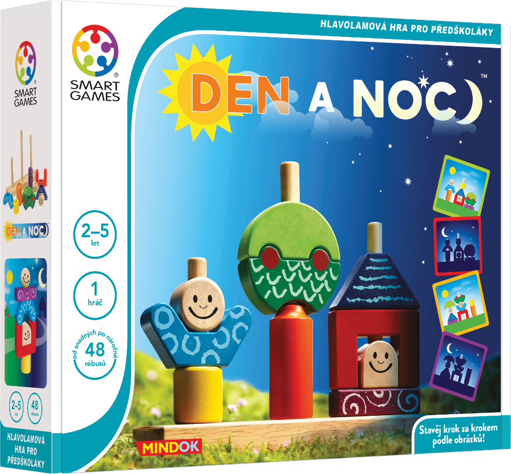 Den a noc je jedinečně zpracovaná logická hra pro jednoho hráče. Je vyrobena ze dřeva, krásně barevná a založena na myšlence, která rozvíjí logické myšlení a představivost i těch nejmenších dětí.