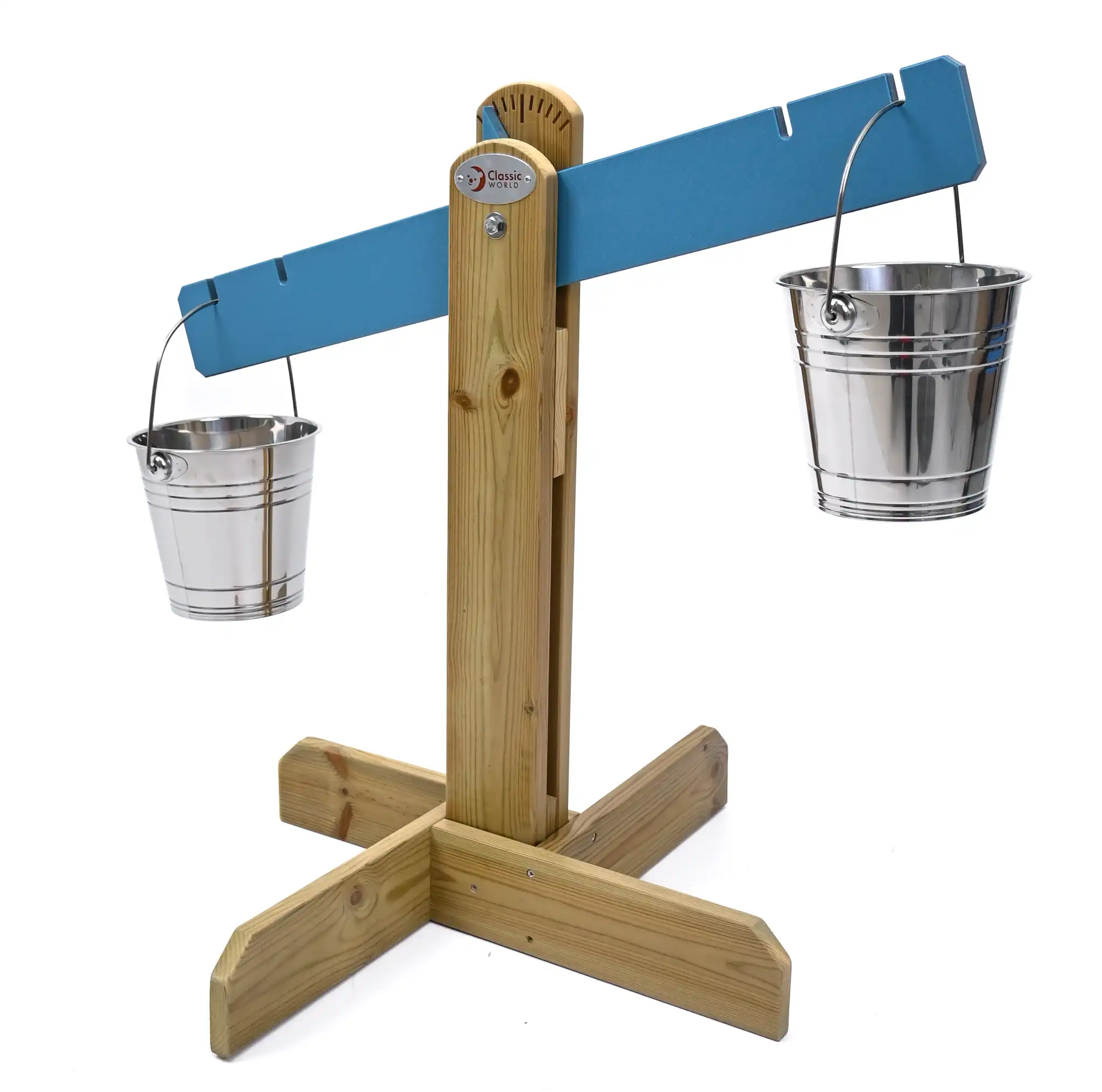 Tato dětská dřevěná váha Classic World je balanční váha určená pro nekonečné vyvažování jak písku, tak vody. S touto váhou mohou děti naplňovat kovové kbelíky pískem, vodou nebo oblázky tak, aby byly v jedné přímce. Tato ideální sada je skvělým nástrojem pro rozvoj manuálních zručností, kreativity a logického myšlení.
