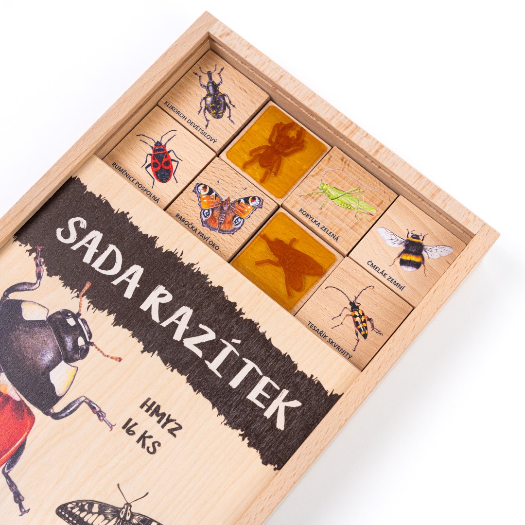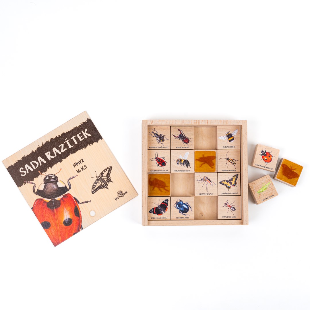 Sada 16 dřevěných razítek představuje nejznámější obyvatele hmyzí říše. Je to kouzelná cesta, jak děti přirozeně vtáhnout do světa přírody a podnítit jejich fantazii.