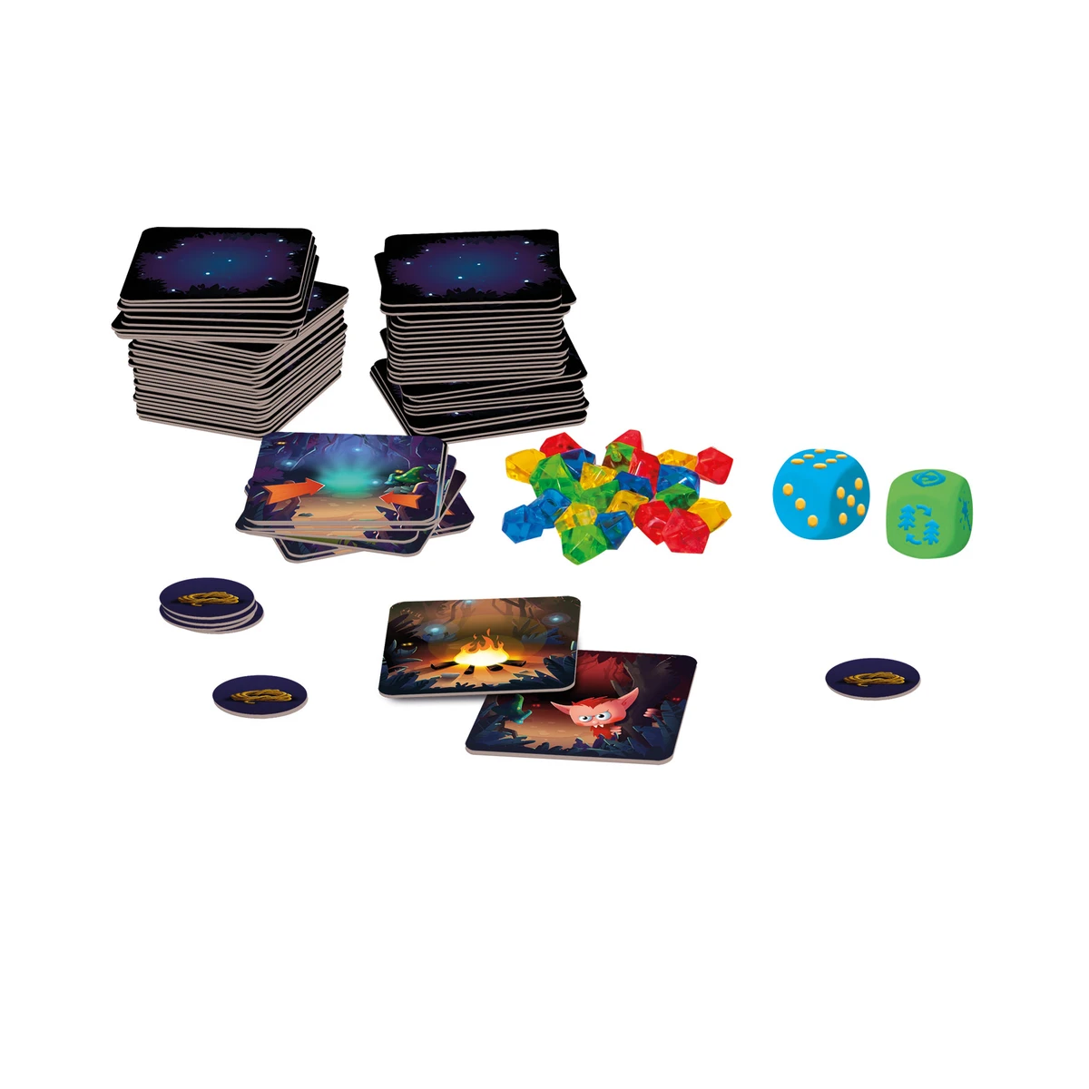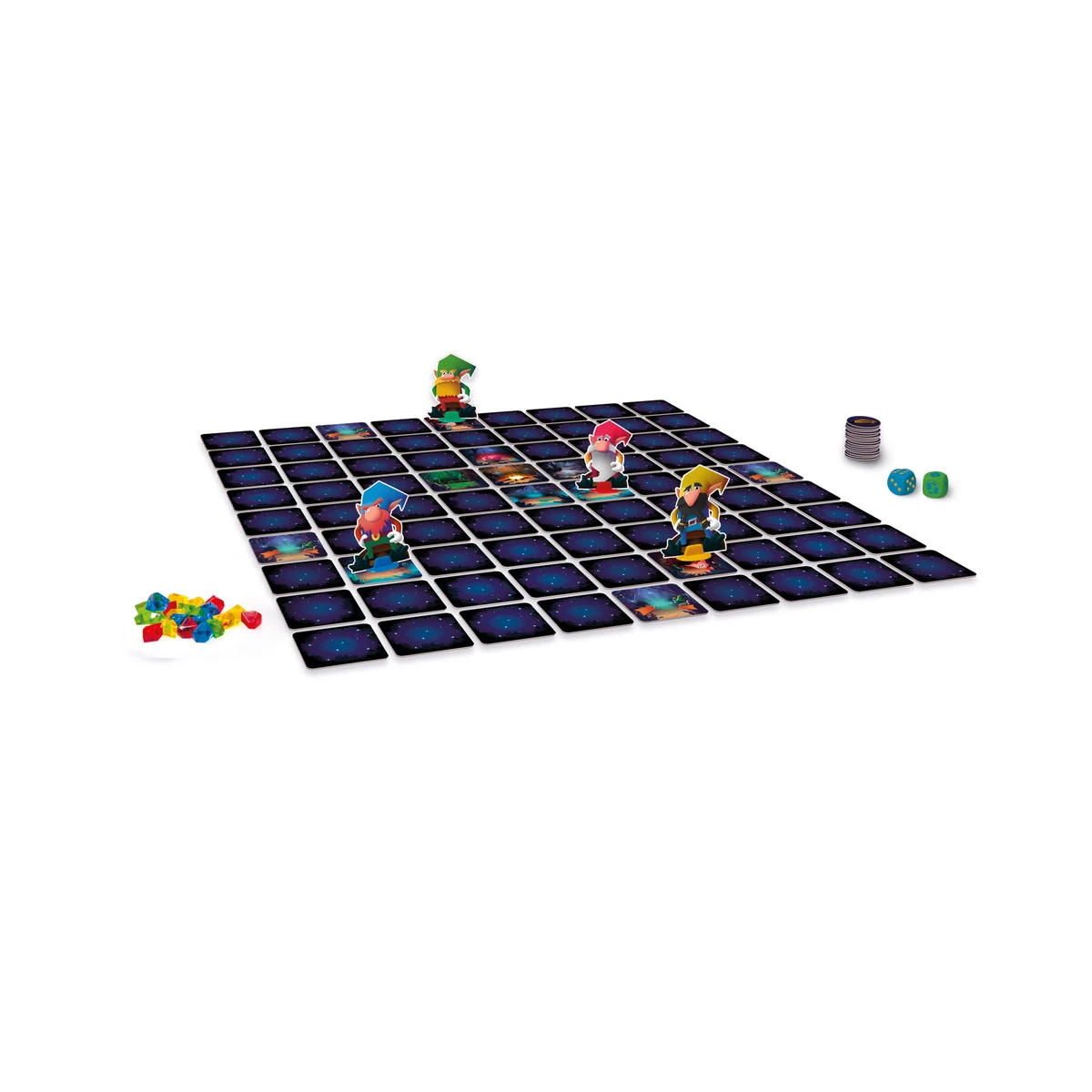 Balení obsahuje: 81 herních dílků, 16 diamantů, 15 žetonů vybavení, 4 figurky trpaslíků, 4 stojánky k figurkám, 1 kostku s body, 1 kostku se symboly.