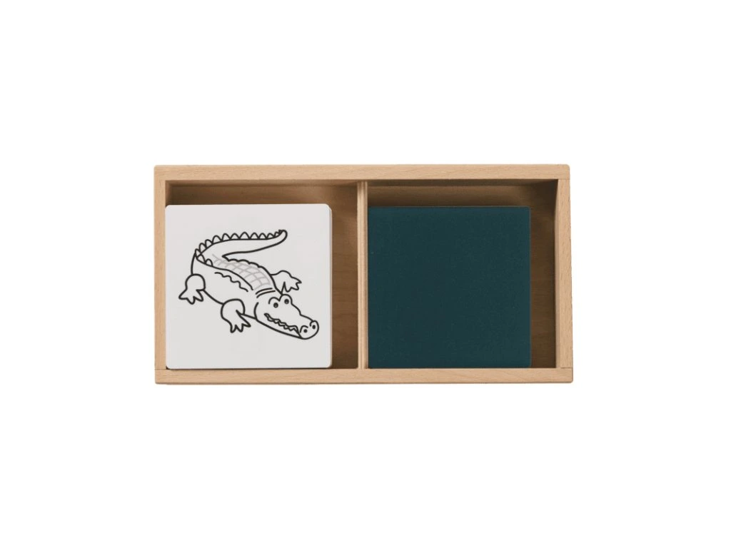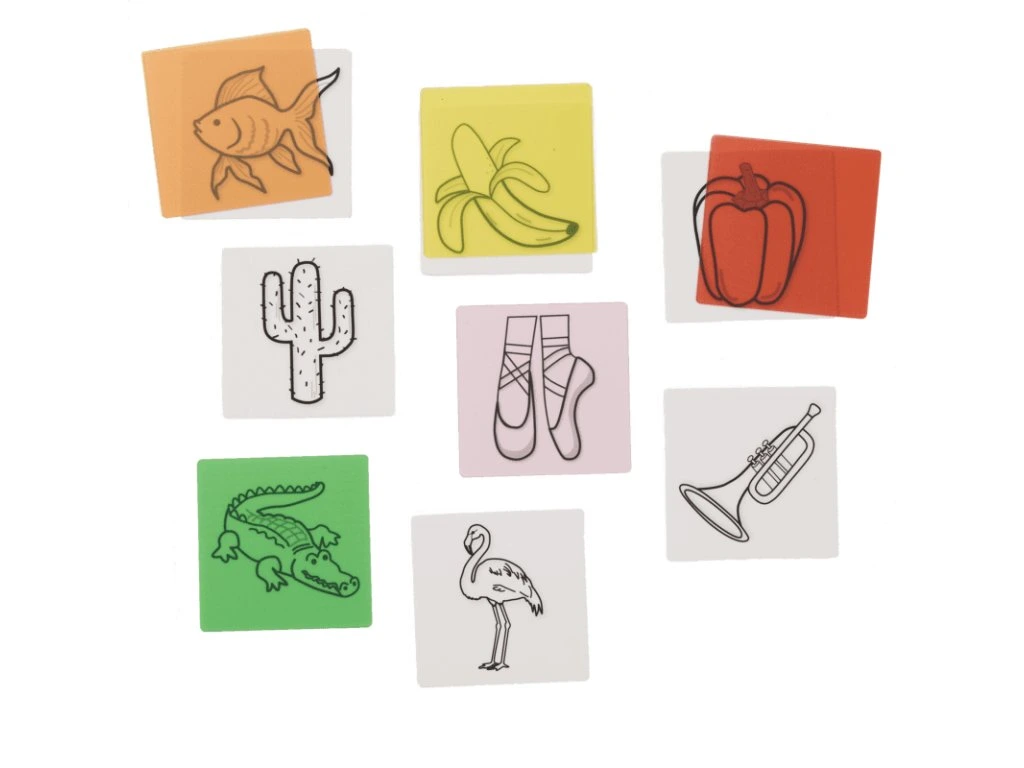 Hravá sada kombinující obrázky předmětů s průhlednými barevnými kartami - děti přiřazují barevnou fólii ke správnému obrázku (např. červené jablko či zelený list), čímž procvičují slovní zásobu, komunikaci, logické myšlení a barvy.