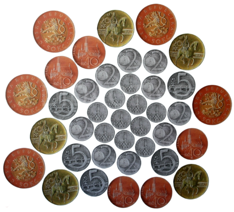 Sada obsahuje velké žetony s grafikou odpovídající českým korunám.