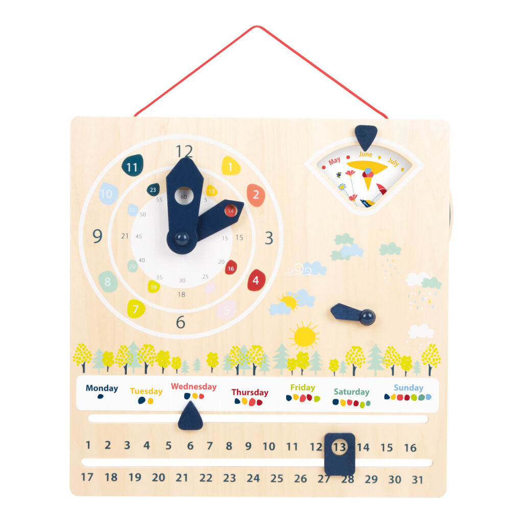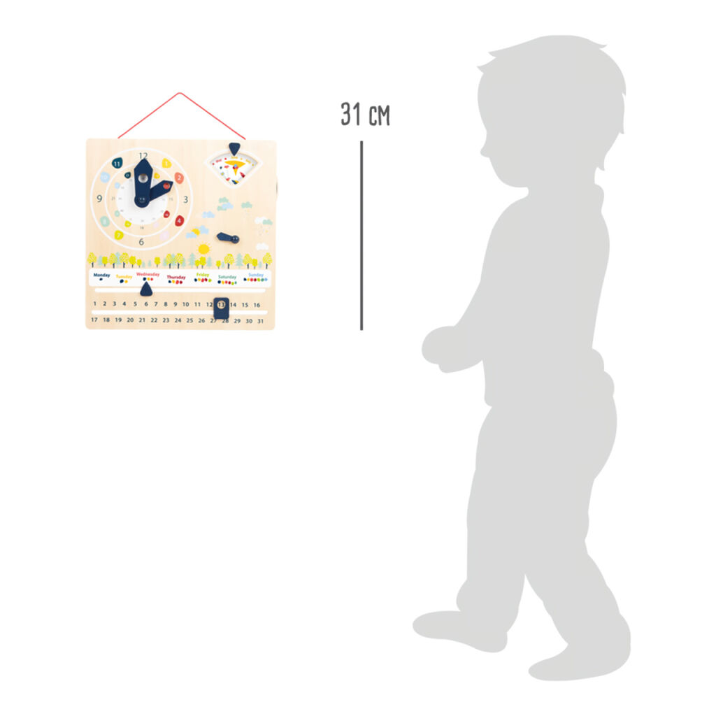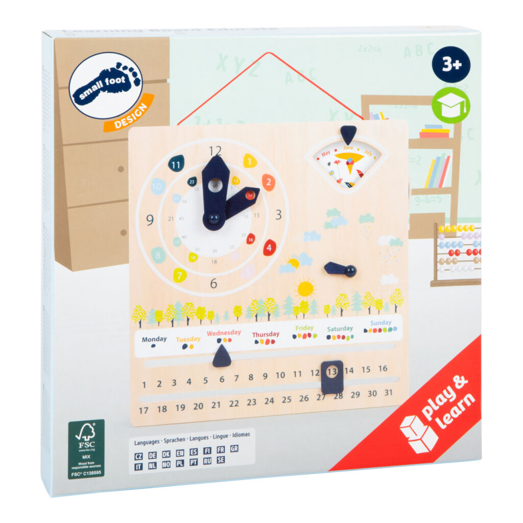 Podporují děti v učení se času ve 12 a 24 hodinovém systému. Současně zprostředkovávají znalosti o počasí, dnech v týdnu, měsících a ročních obdobích hravým způsobem pomocí jednoduchých ilustrací. Při nastavování ručiček jsou současně trénovány motorické dovednosti. Se závěsným zařízením a nálepkami, pro použití v 15 evropských jazycích: CZ, DE, DK, EN, ES, FI, FR, GR, IT, NL, NO, PL, PT, RU, SE.