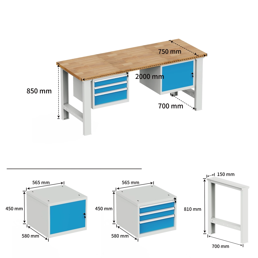 Pracovní deska 40 mm vodovzdorná buková spárovka. Noha výška 810, šířka 150, hloubka 699 mm. Podvěsný kontejner a podvěsný kontejner se třemi zásuvkami, výška 450, šířka 565, hloubka 580 mm. Stůl má nosnost 500 kg, výšku 850, šířku 2000, hloubku 750 mm, barva konstrukce světle šedá RAL 7035, barva zásuvek a dveří RAL 5012.
