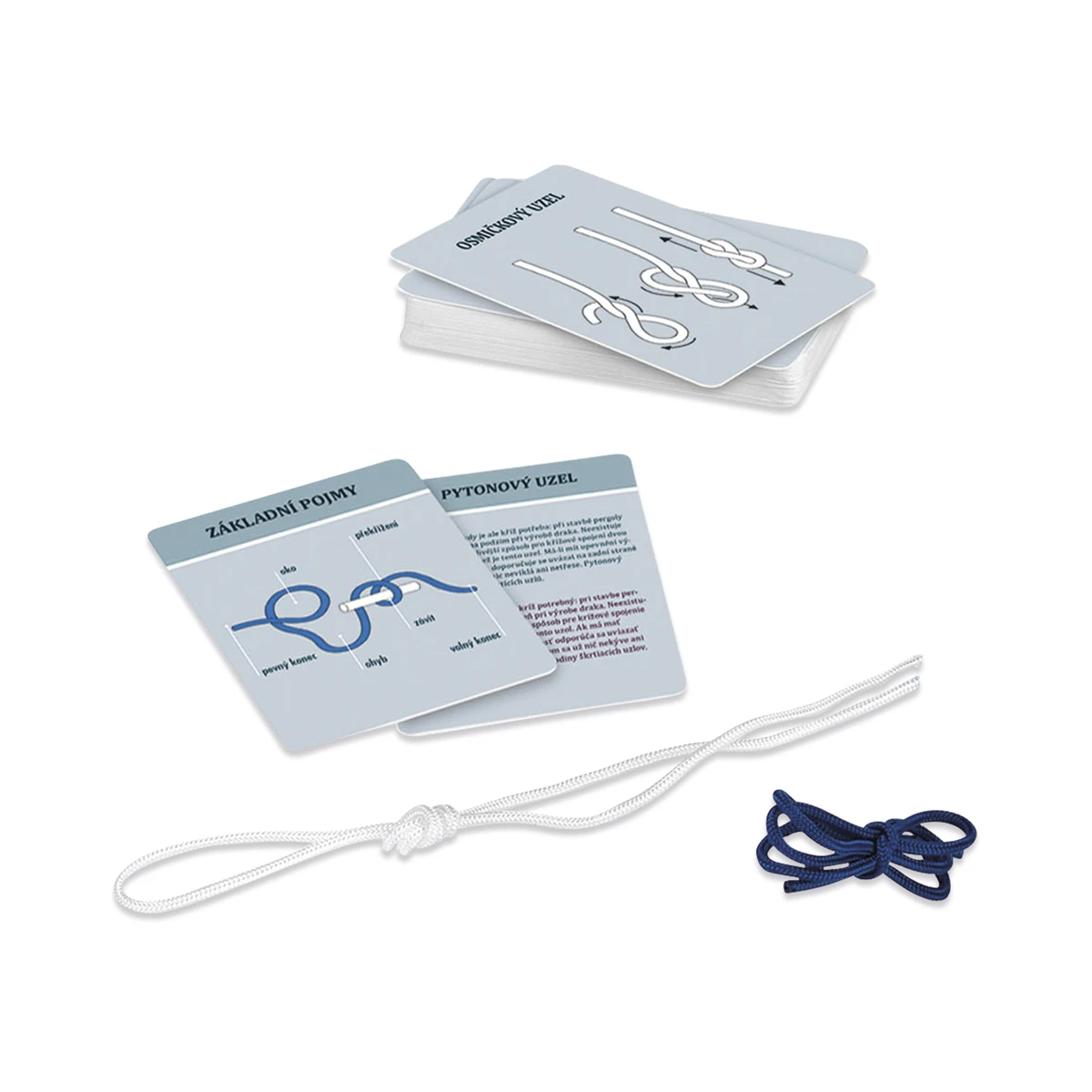 Balení obsahuje: 50 kartiček s návody na vázání uzlů, modrý a bílý provázek.