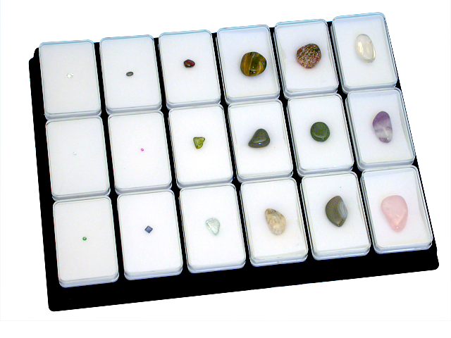 Soubor základních drahých kamenů (např. ametyst, růženín, opál, achát, olivín, granát, jaspis, tygří oko, křišťál, rubín, safír, atd.) a syntetického zirkonu – celkem 18 kusů. Vzorky jsou ve formě jak leštěných nepravidelných tvarů, tak ve formě šperkových brusů. Jednotlivé kameny jsou uloženy v průhledných uzavíratelných krabičkách, které jsou uloženy v kazetě z prolisované plastické hmoty. U každého minerálu je uveden název, chemický vzorec a soustava.