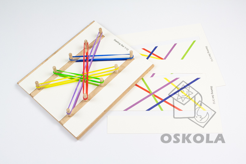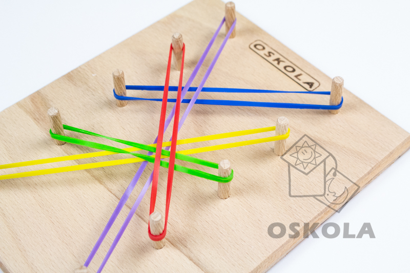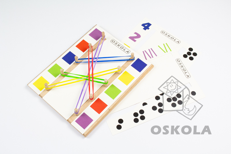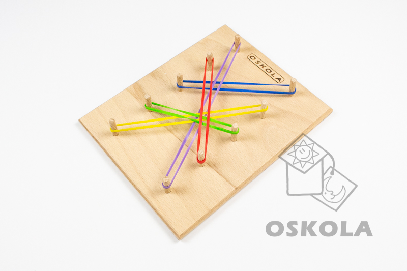 Sada obsahuje dřevěnou desku s deseti dřevěnými kolíčky a barevné gumičky (4 x 5 barev, celkem 20ks).