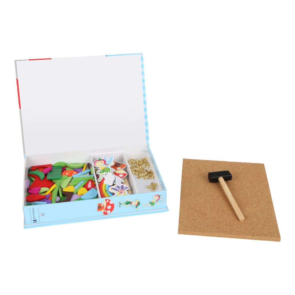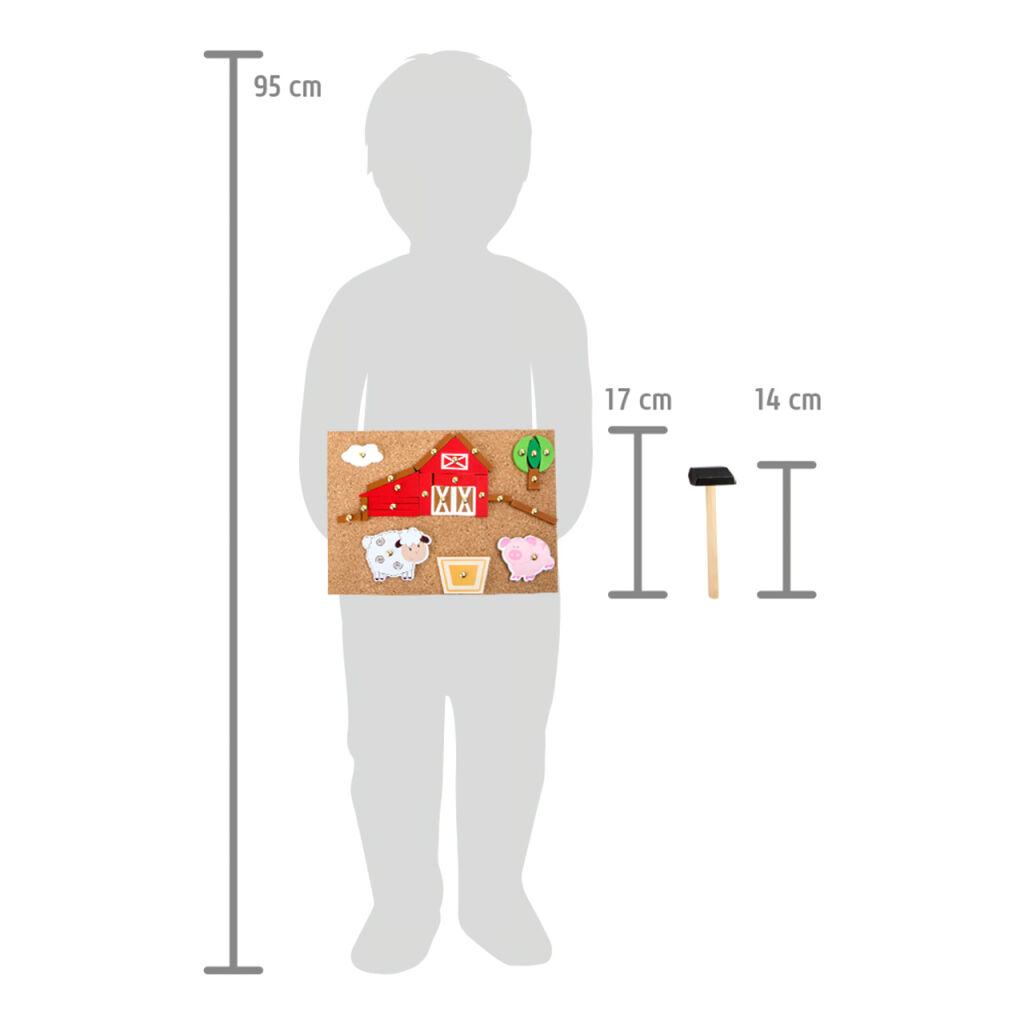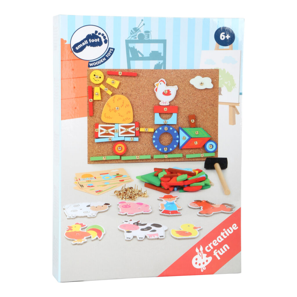 Tvůrčí zábava nikdy nekončí! S tímto kladívkem, dílky a korkovou deskou můžete vytvořit mnoho podob farmy. Čtyři vzorové karty navrhují motivy obrazu. Sada je balena v boxu a snadno se přepravuje.