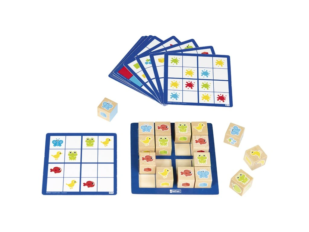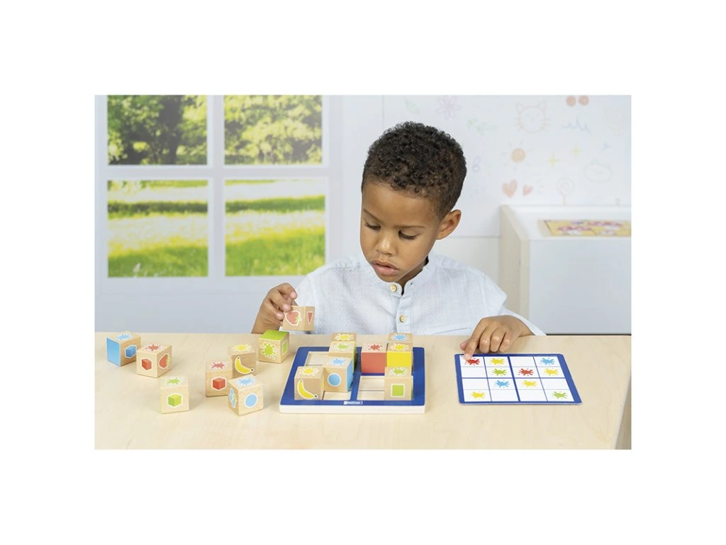 Logická hra na principu jednoduššího sudoku. Dítě vyplňuje kostkami s různými motivy malé čtverce na dřevěné podložce - stejný motiv musí být v řádku, sloupci i velkém čtverci pouze jednou.