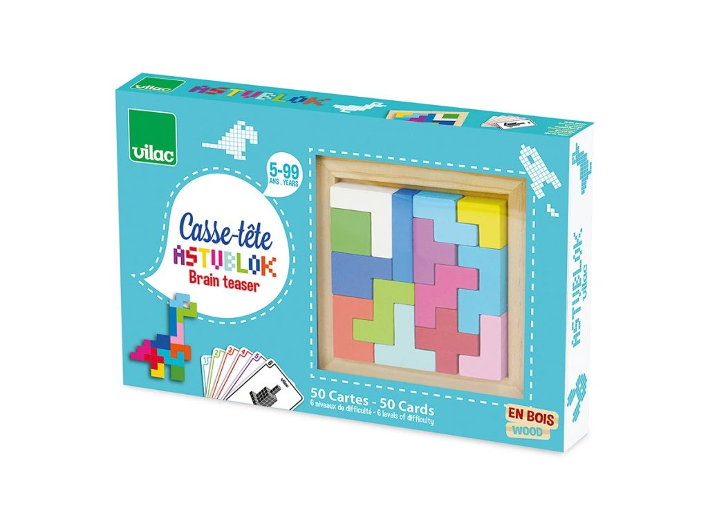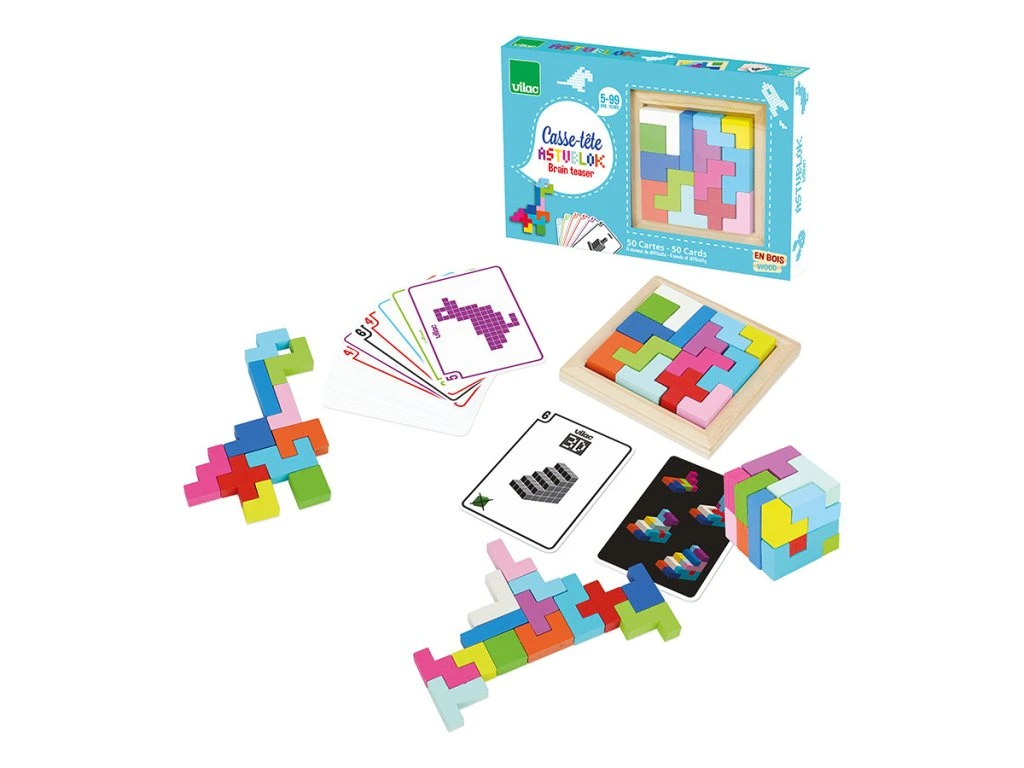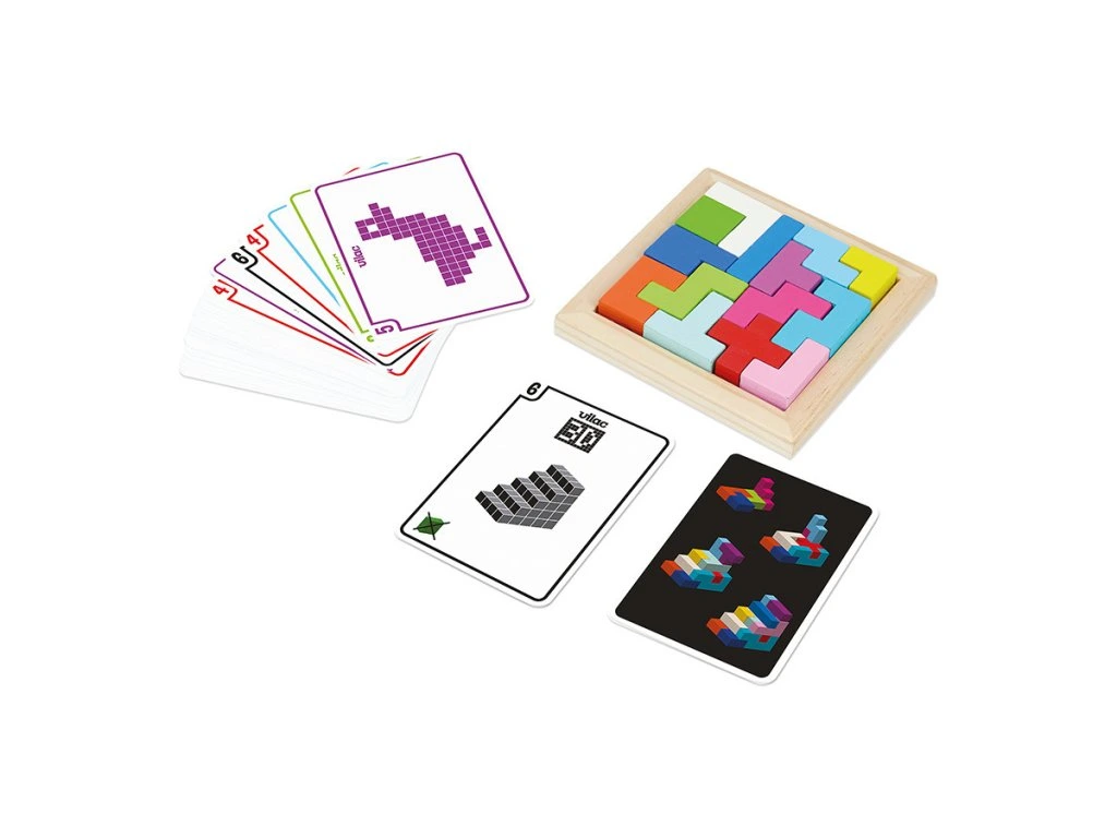 Krabice plná předloh a tangramů – hlavolamů v různým geometrických tvarech ve stylu Tetris. V balení 50 různých kartiček s obrázky, podle kterých můžete stavět. Návody pro 2D i 3D stavění. Vyrobeno ze dřeva.