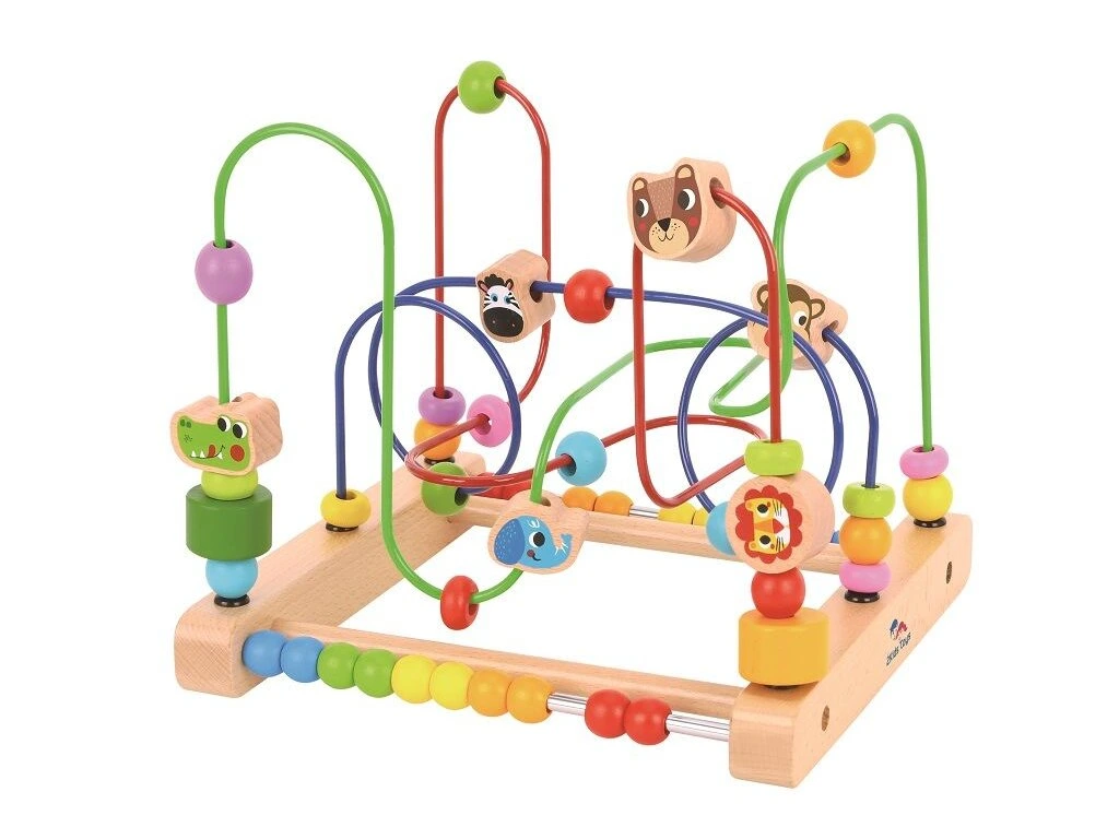 Labyrint na dřevěném podkladu pomáhá dětem nejen se seznamovat s barvami, ale především trénovat jemnou motoriku při posouvání korálků. Díky dostatečnému množství těchto rozmanitých korálků, mezi kterými najdete roztomilé zvířecí kamarády (lev, zebra, krokodýl, slon, opička, medvěd), lze hračku využít i k edukativní hře a pomalu u naších ratolestí vytvářet pozitivní vztah k učení a počtům.