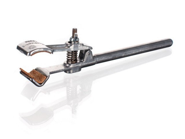 Držák se upíná křížovou svorkou na tyč stojanu. Maximální rozevření čelistí je 40 mm. Výstelka čelistí je z korku. Průměr upínané části je 11 mm.