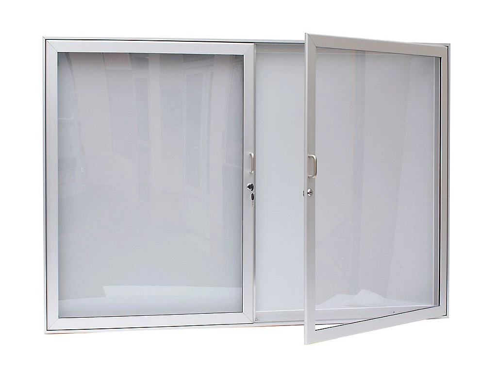 Odolná dvojkřídlá vitrína z elegantních tenkých profilů s hloubkou 40 mm. Vyznačuje se zejména výtečným poměrem cena a užitná hodnota. Vhodná je jak do exteriéru tak do interieru, v provedení na zeď i na dvojici sloupků.