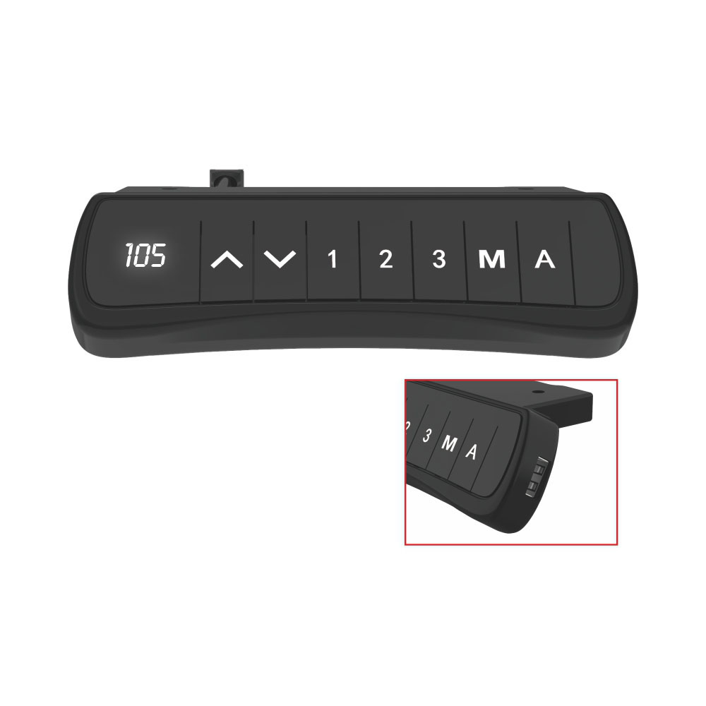 Ovladač je vybaven displejem s ukazatelem výšky a automaticky počítá s tloušťkou desky 2,5cm – tzn. pokud je podnož např. v nejnižší možné výšce, bude ovladač ukazovat 60,5cm. Pokud použijete jinou tloušťku desky, musíte s touto “odchylkou” na displeji počítat. Ovladač je vybaven displejem s ukazatelem výšky, který se při nečinnosti zhasne a nabíjecím USB-A.