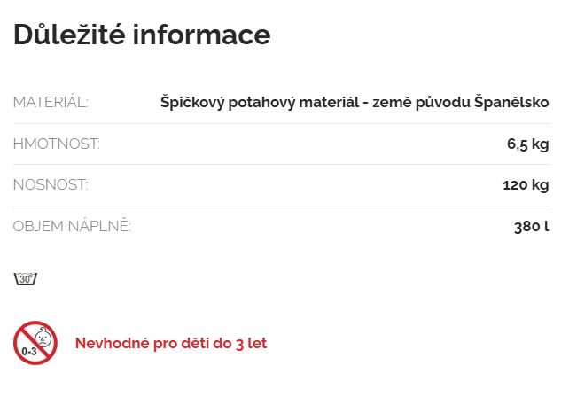 Dvouvrstvý sedací pytel s odnímatelným a pratelným potahem nabízí vysokou kvalitu a snadnou údržbu. Vysoce kvalitní španělská potahová látka má odolnou protišpinivou úpravu a samotný pytel je pevný díky dvojitým švům, což zaručuje dlouhou životnost. Vnitřní vak je pak vyroben z pevné netkané textilie.