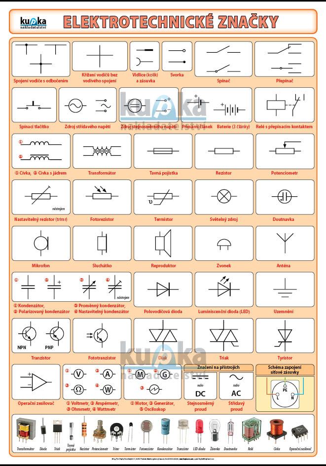 Obraz obsahuje základní elektrotechnické schématické značky. Je vhodný jako výuková pomůcka pro žáky základních i středních škol.
