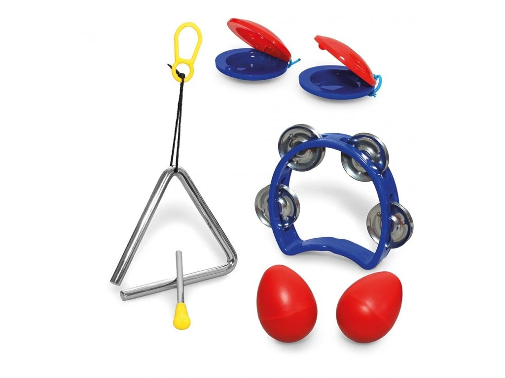 Perkusní sada orfových nástrojů. Oblíbené nástroje pro celou rodinu, které rozvíjí hudební dovednosti a hravost. Balení obsahuje tamburínku s plíšky, pár chrastících vajíček, plastové kastaněty a triangl s paličkou.