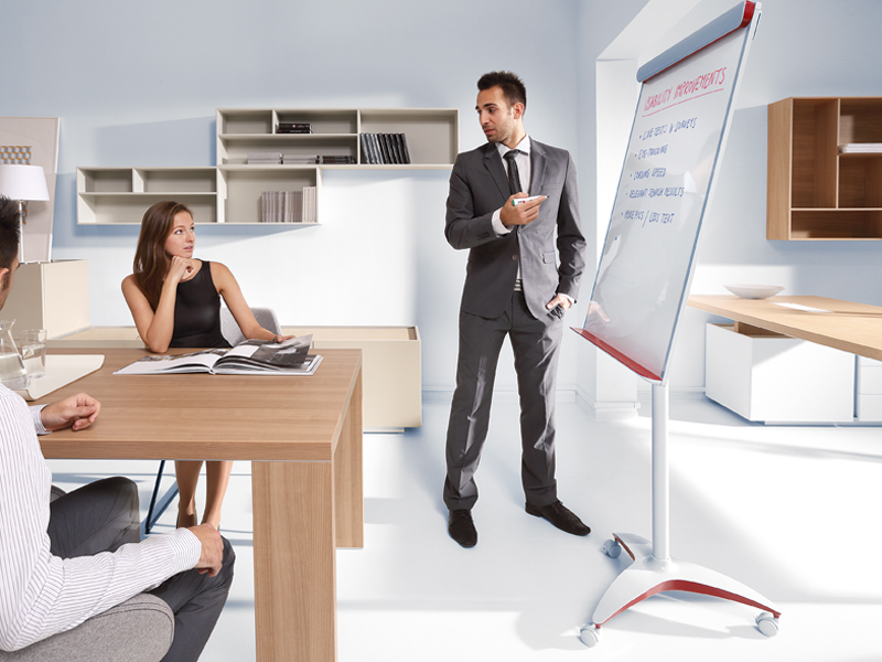 - Kvalitní designový mobilní flipchart s červenými doplňky.
