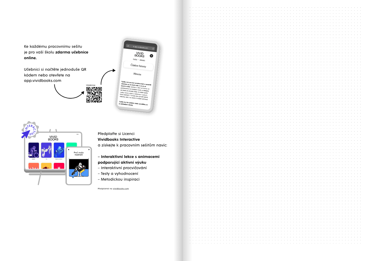 Tištěné pracovní sešity a učebnice z dílny Vividbooks reflektují moderní trendy ve vzdělávání. Do výuky je můžete zapojit samostatně nebo v kombinaci s interaktivní licencí. Od odběru 15 kusů je v ceně i online učebnice s názornými animacemi.