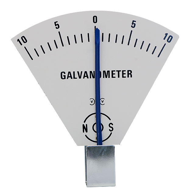 Jednoduchý galvanometr s nulou uprostřed, používá se společně s cívkami pro studentský transformátor.