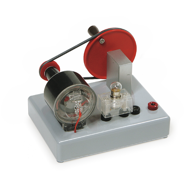 Dynamo má transparentní uzávěr a je tak možné pozorovat cívku a magnetickou kotvu. Základna s řemenovým pohonem má dvě 4mm zdířky pro střídavé napětí a dvě 4mm zdířky pro stejnosměrného napětí.